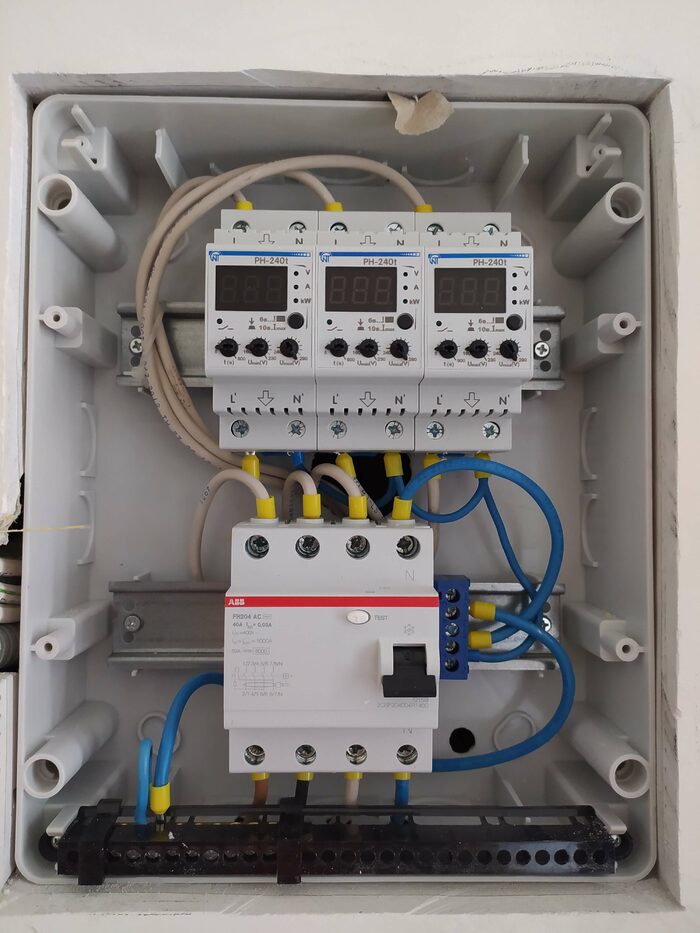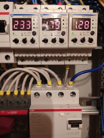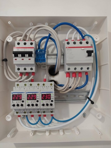 - Монтаж оборудования. Устанавливаем реле в электрощит, подключаем к сети и настраиваем параметры (верхний и нижний порог напряжения, время задержки включения).