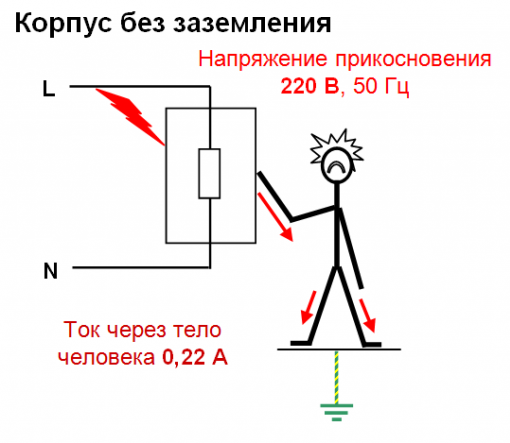 В нашем случае, сопротивление человека (примерно 1000 Ом) будет намного больше, чем сопротивление самого защитного провода + сопротивление контура заземления, которое будет составлять примерно несколько десятков Ом.