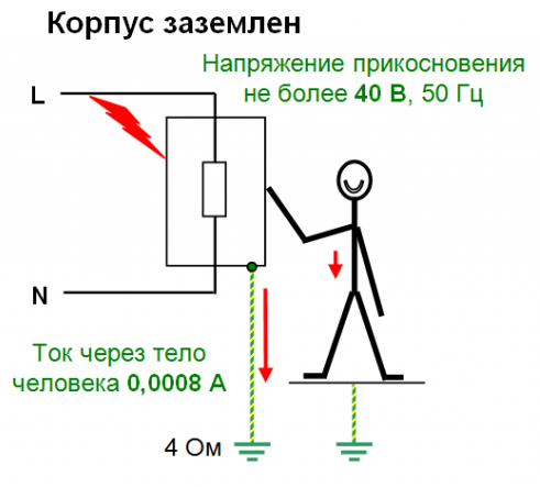И когда вы дотронетесь корпуса электрооборудования, которое заземлено, но с плохой изоляцией, то вы ничего не почувствуете, потому что ток всегда «бежит» по пути наименьшего сопротивления.