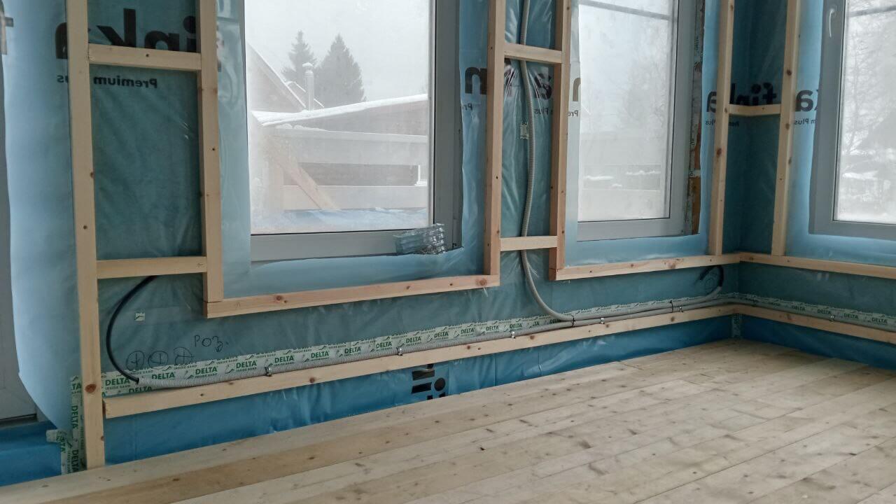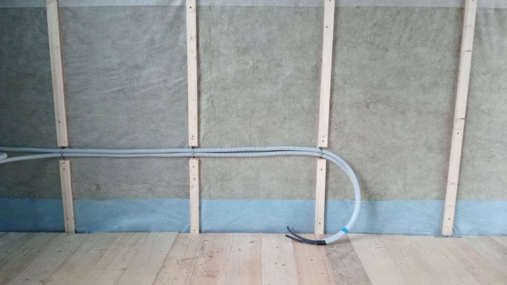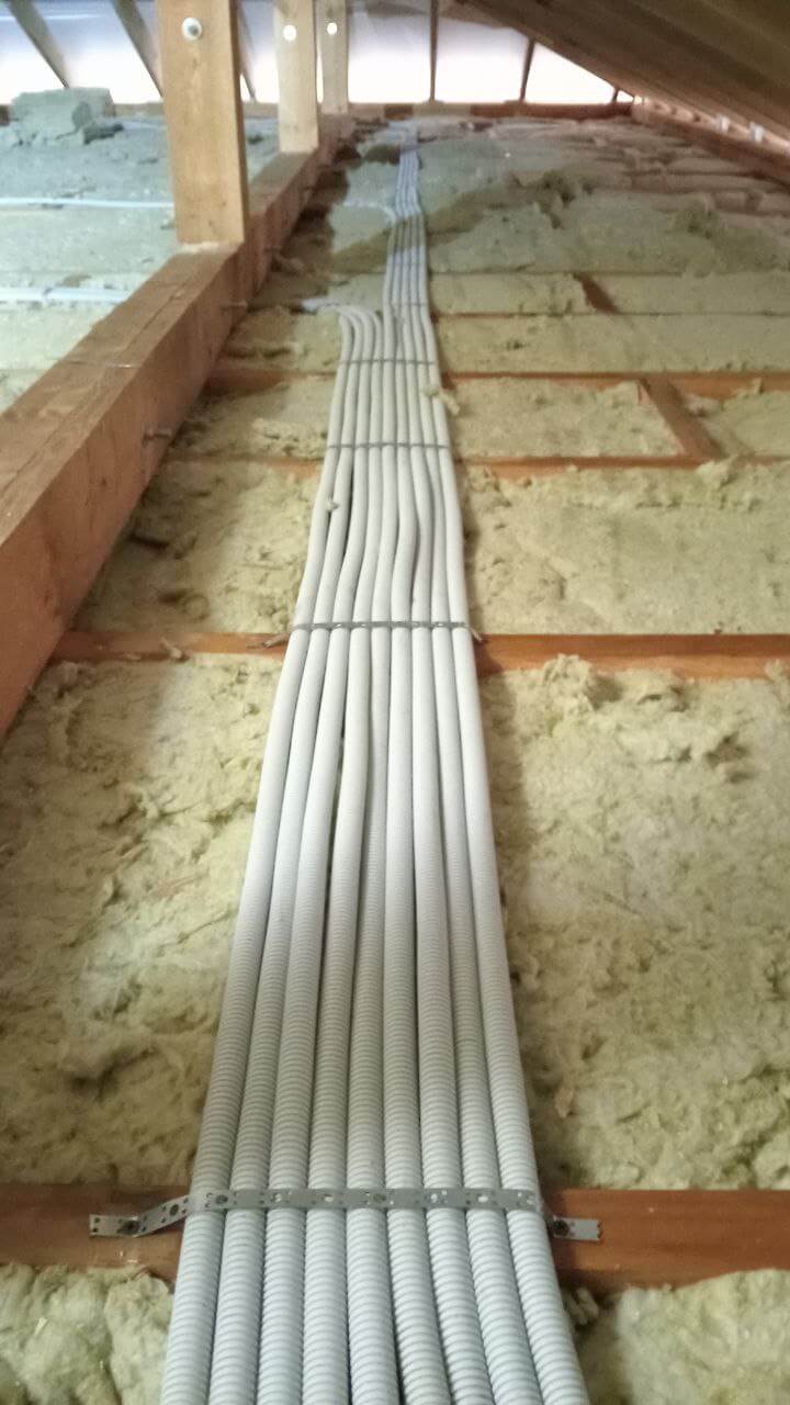 По просьбе заказчика прокладываем кабель Конкорд в тяжелой гофре DKC. Прокладка линий осуществляем по чердаку дома с опусками к точкам подключения оборудования и установки розеток с выключателями.